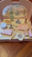 Este tocador portátil de madera con espejo y más de 10 accesorios reales en versión mini es el compañero ideal para peques curiosas y creativas. Incluye todo lo necesario: esmaltes, perfume, brochas, maquillaje, cepillo, secadora y más. Su diseño plegable permite cerrarlo como una maleta y llevar la diversión a donde vayan.