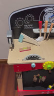Este banco de herramientas es el más grande y completo de nuestra colección. Diseñado especialmente para manos pequeñas con grandes ideas, incluye una increíble variedad de herramientas y accesorios de madera que imitan con gran detalle las herramientas reales: serrucho, martillo, destornillador, pinzas, engranajes, nivel, tornillos, tuercas ¡y mucho más!